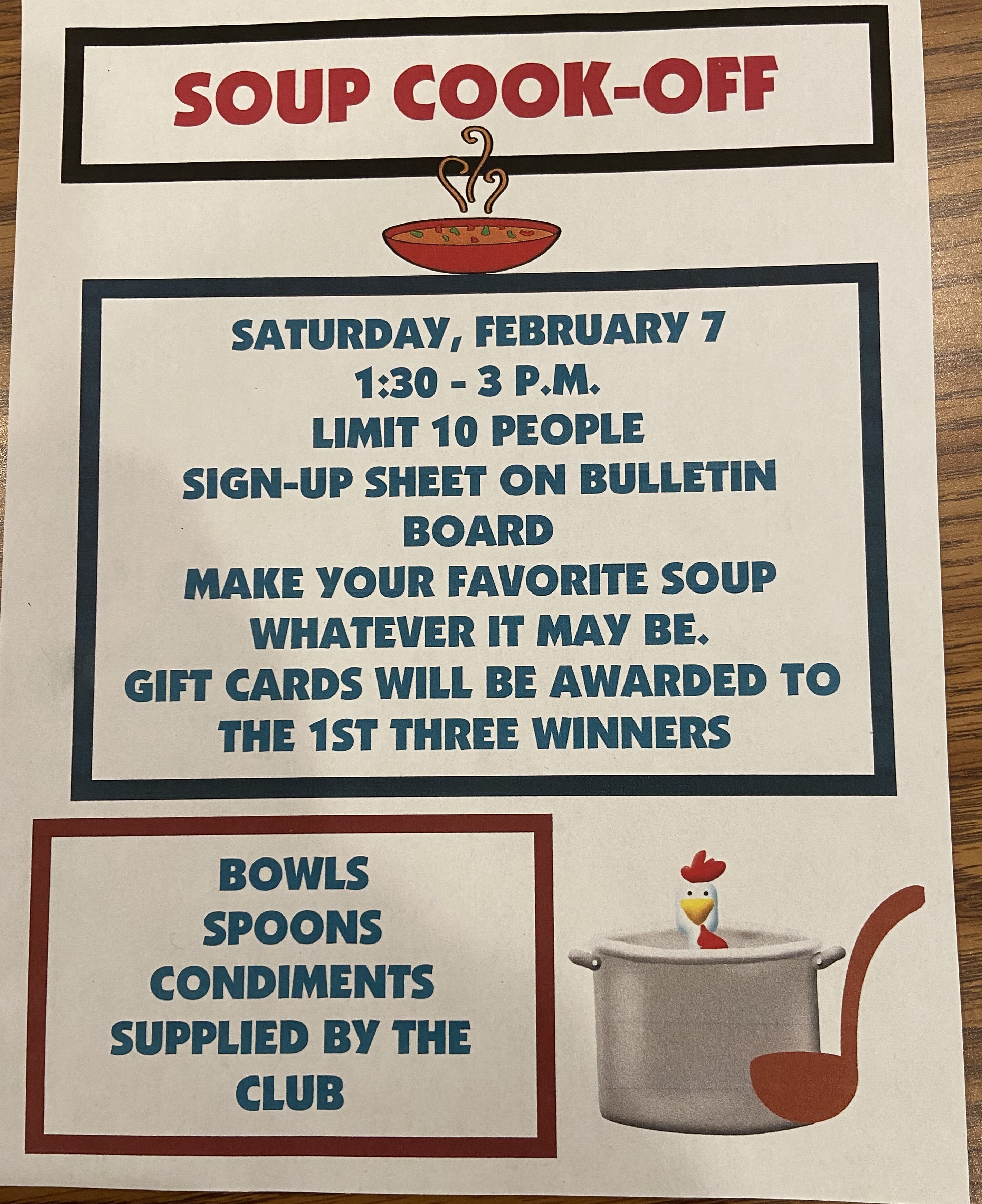 Then all can come and taste soup and vote for 1st through 3rd place winners!
